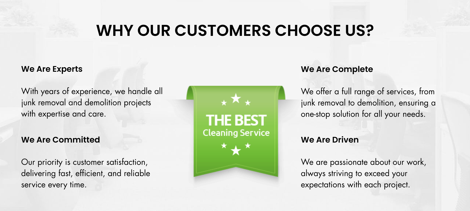 Our mission is to provide fast, reliable, and eco-friendly junk removal and demolition services that cater to both residential and commercial needs. We are committed to offering a seamless and hassle-free experience for our clients, ensuring that all unwanted items and structures are removed efficiently. Our team takes pride in not only helping you clean up and clear out, but also in transforming your space into a more organized, functional, and clutter-free environment. With our dedication to sustainability and customer satisfaction, we make sure your space is left cleaner and better than ever before.
